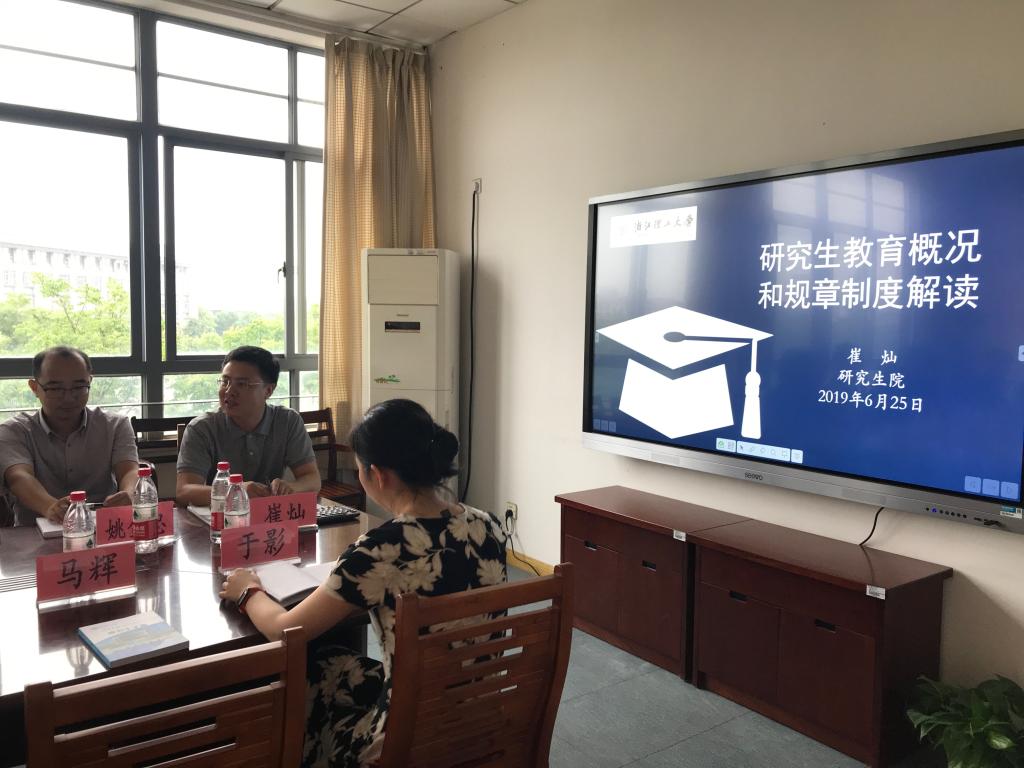 培训会上,崔灿院长对浙江理工大学的研究生教育概况和规章制度等作了详细解读,并与参加培训的研究生导师在学生培养、科学研究及社会合作等方面进行了广泛交流。通过培训让各位导师尽快熟悉浙江理工大学研究生教育的宗旨与目的、了解研究生培养的特点与规律、明确导师自身职责与任务,强化了导师们的人才培养意识、岗位职责意识和立德树人目标,帮助导师更好的培养研究生。